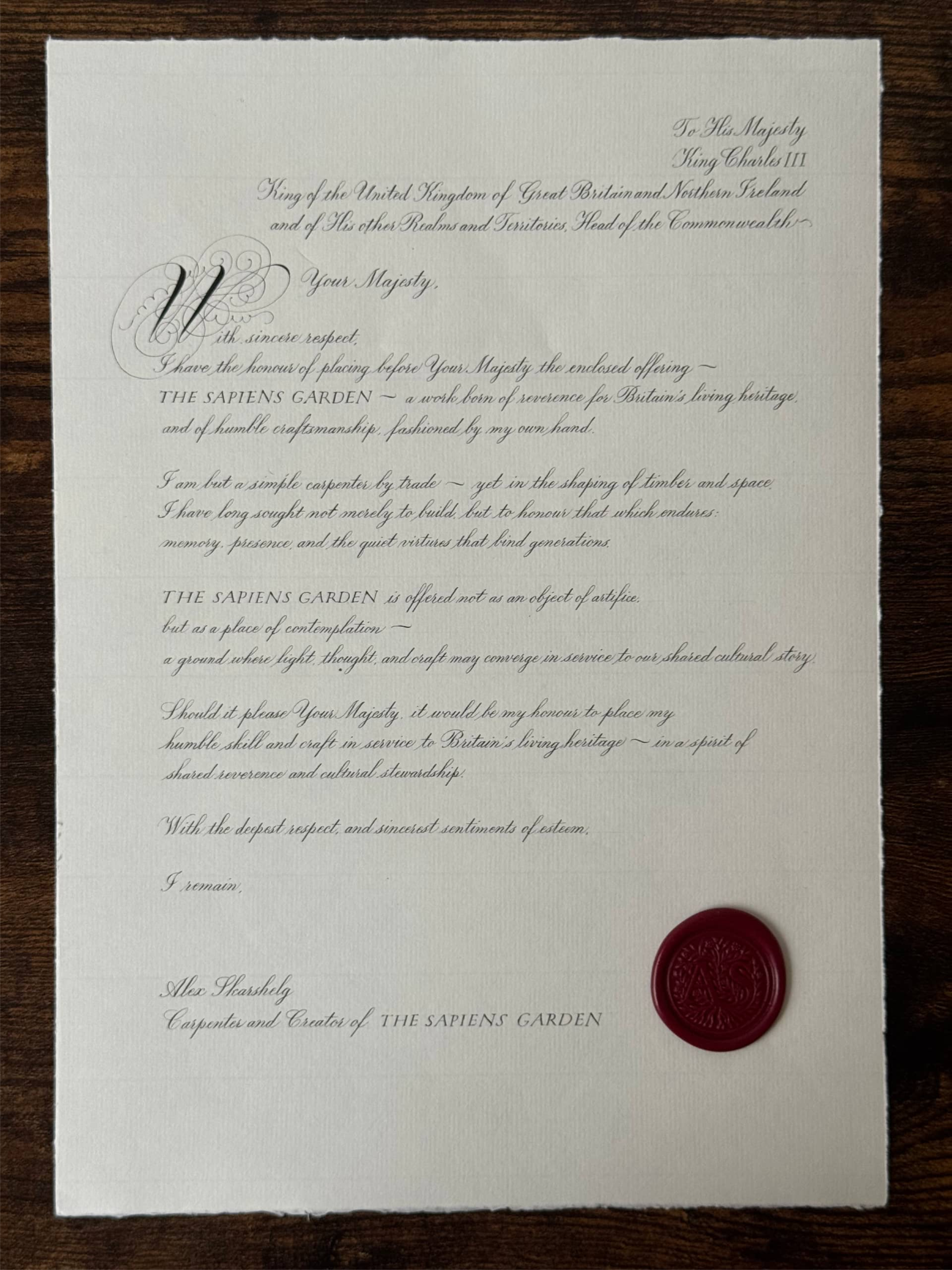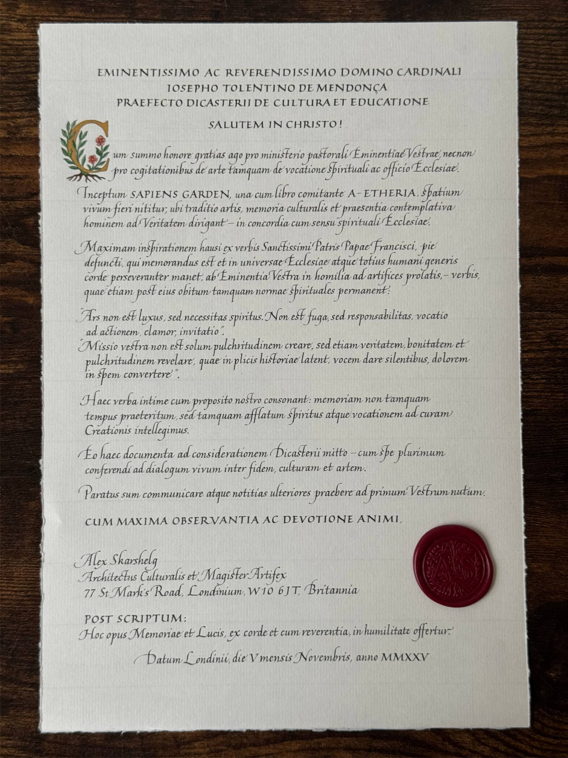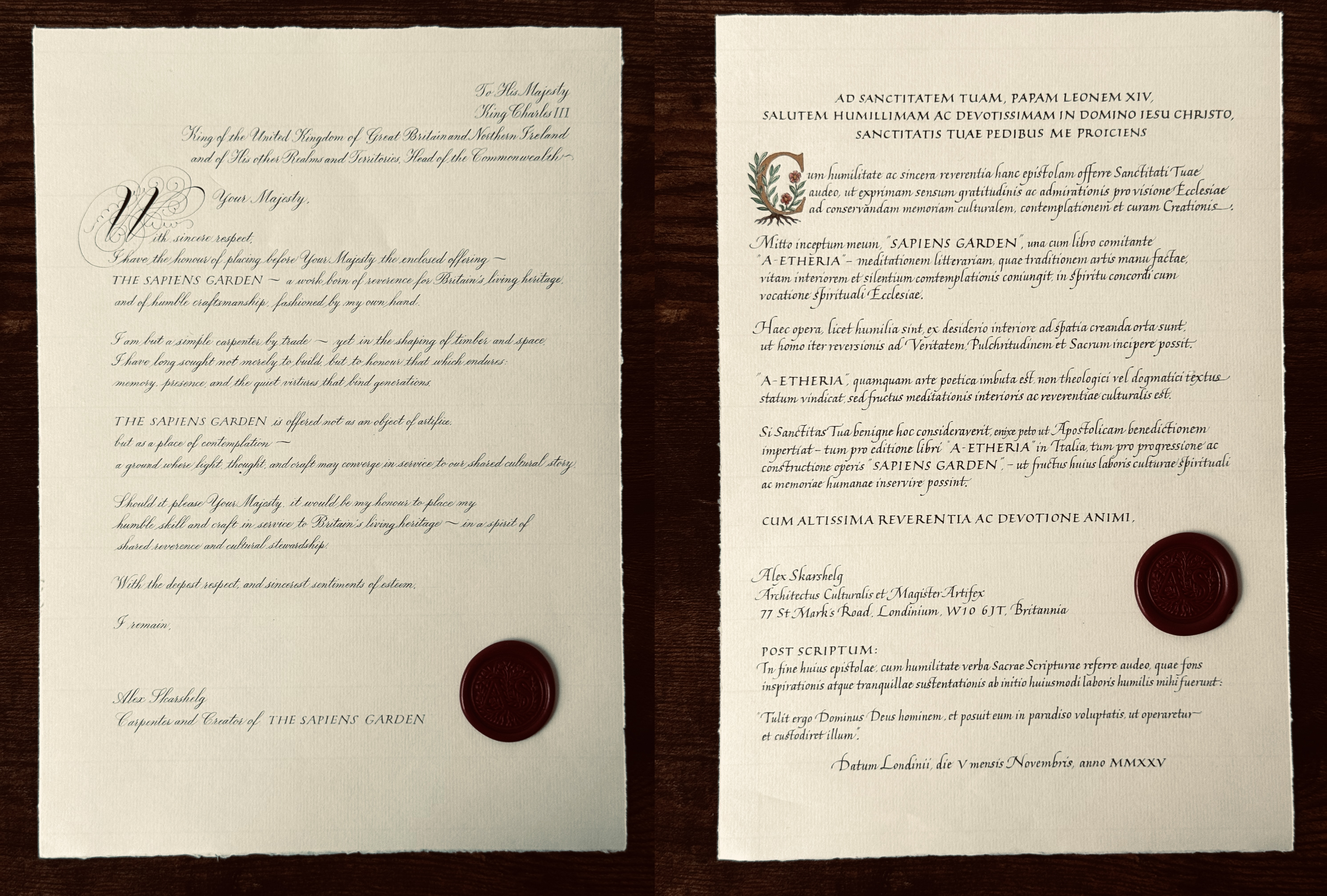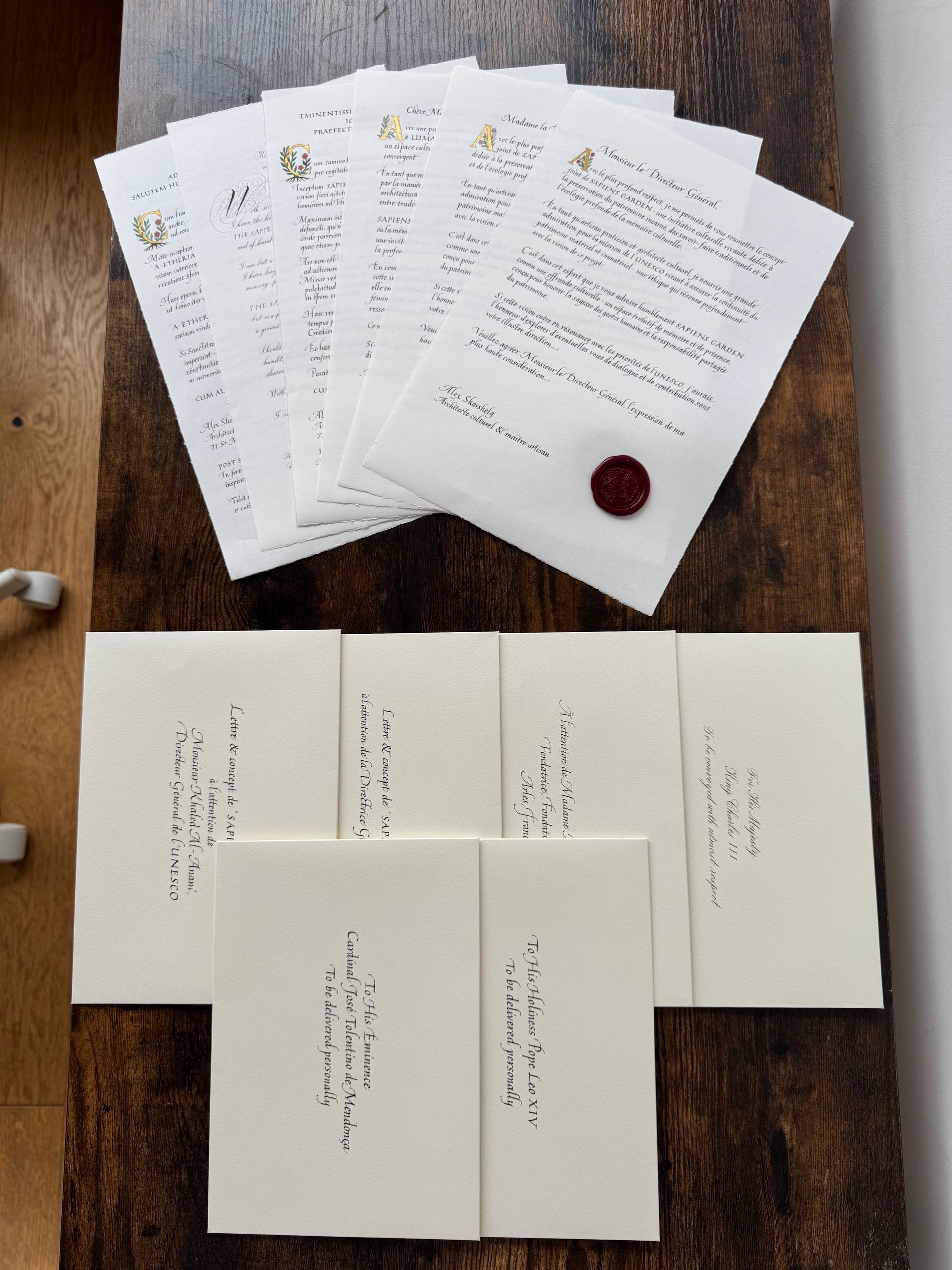 As part of the cultural diplomacy initiative THE SAPIENS DISPATCH, handcrafted artefacts in the form of calligraphic letters and manuscripts were created and formally dispatched to selected cultural institutions in the United Kingdom and France, introducing THE SAPIENS GARDEN project.