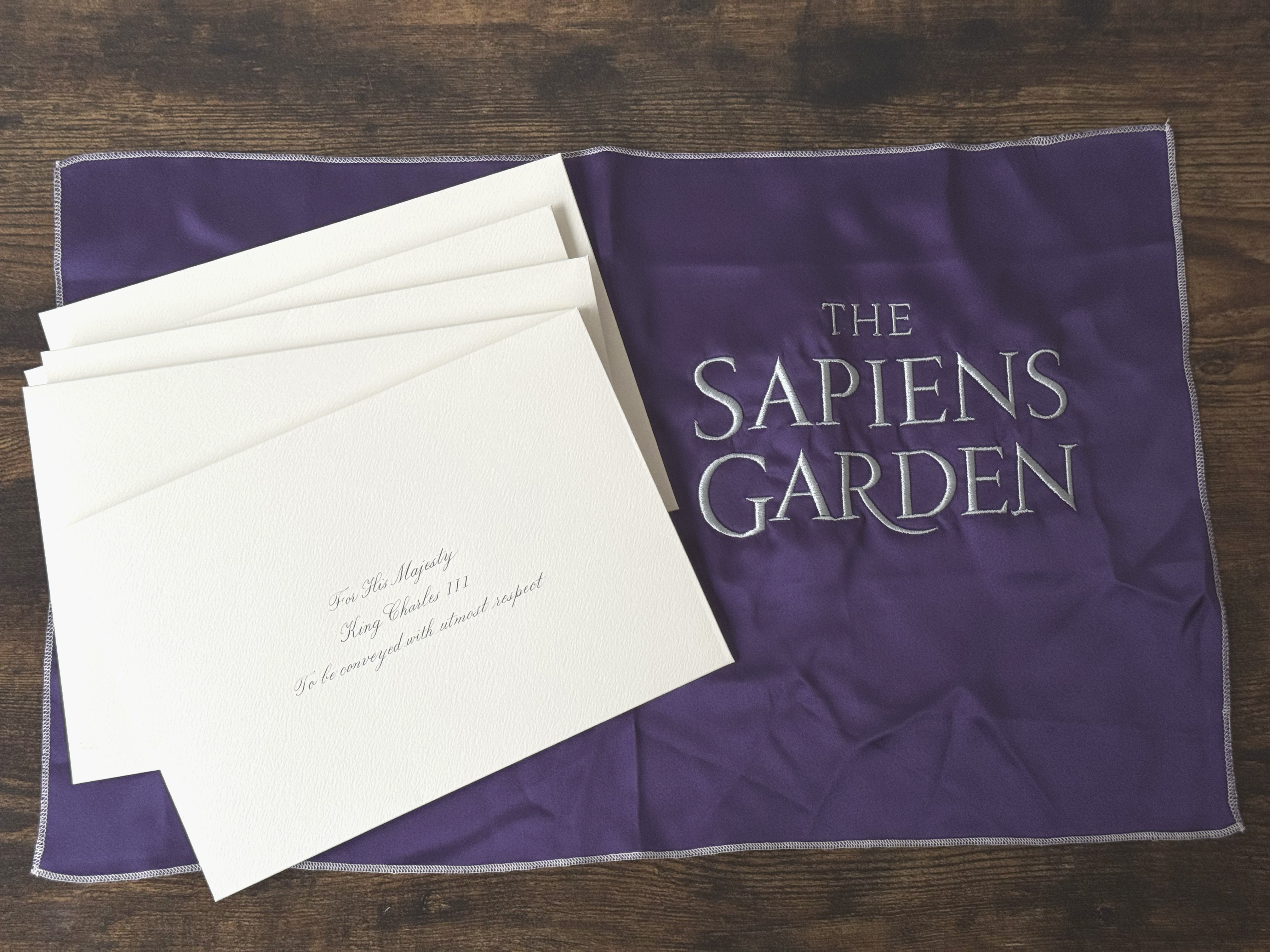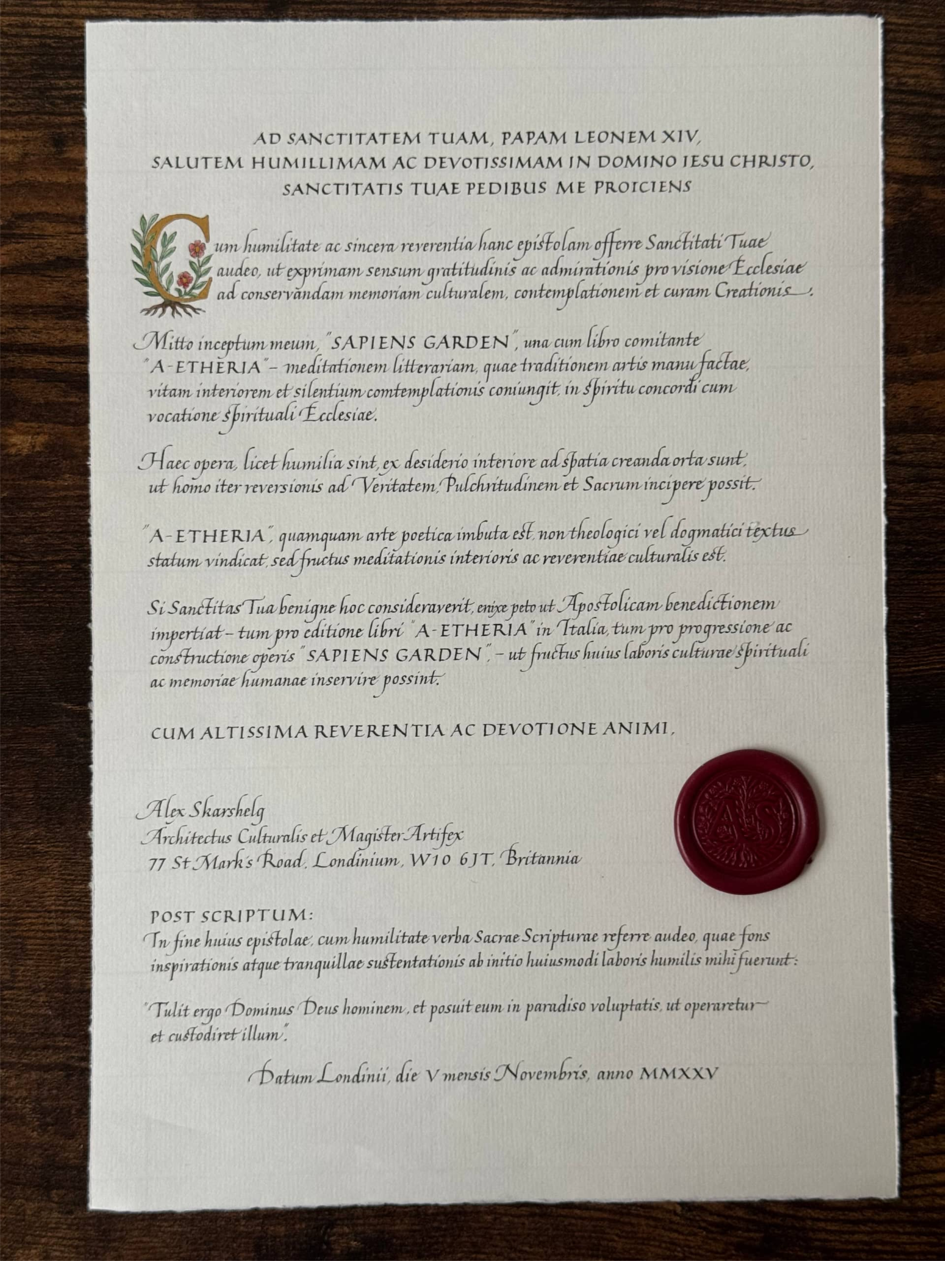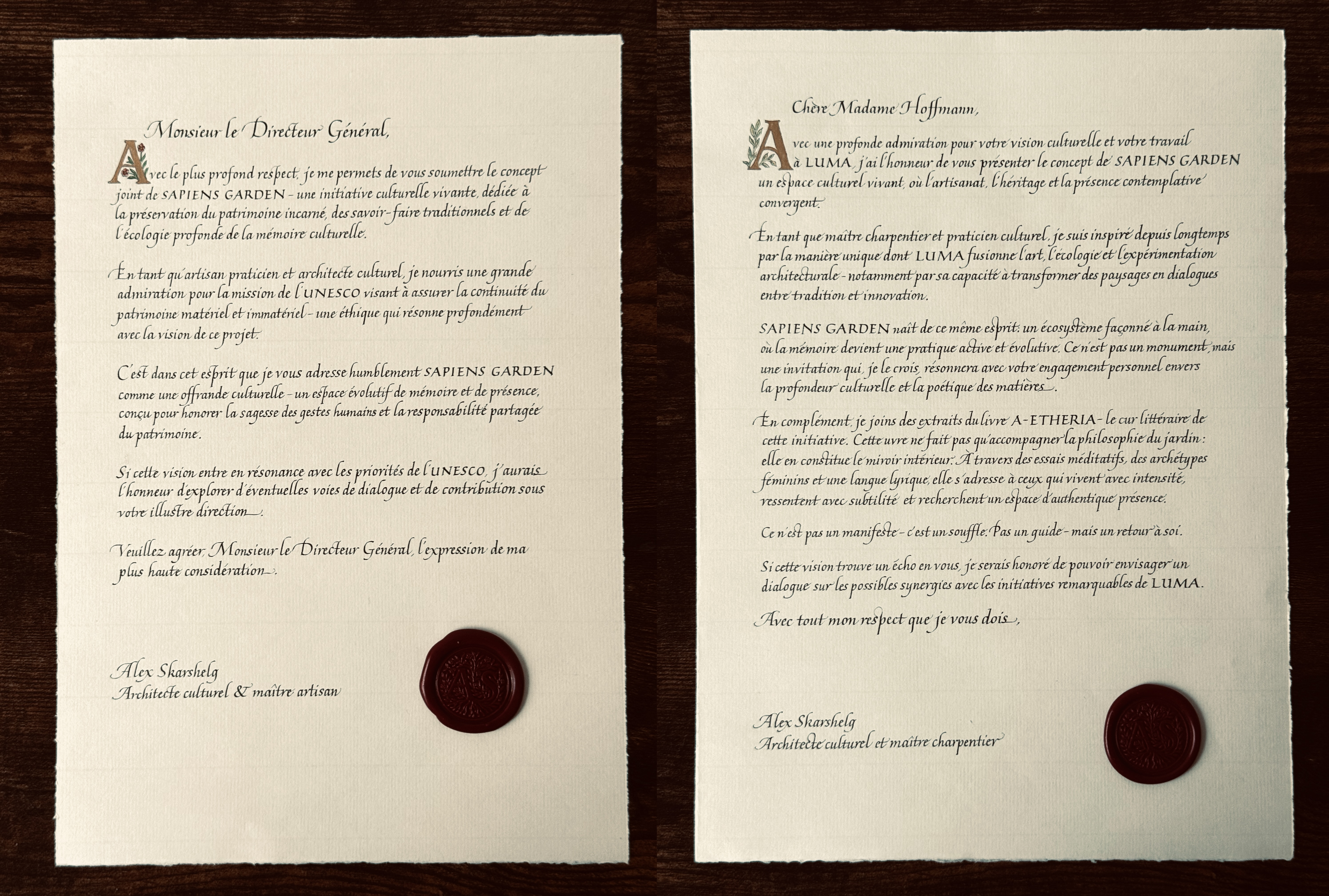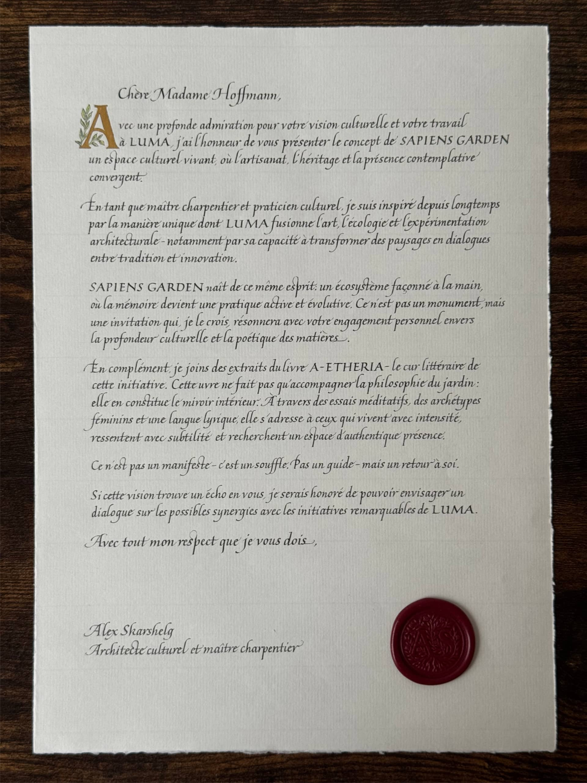 As part of the cultural diplomacy initiative THE SAPIENS DISPATCH, handcrafted artefacts in the form of calligraphic letters and manuscripts were created and formally dispatched to selected cultural institutions in the United Kingdom and France, introducing THE SAPIENS GARDEN project.